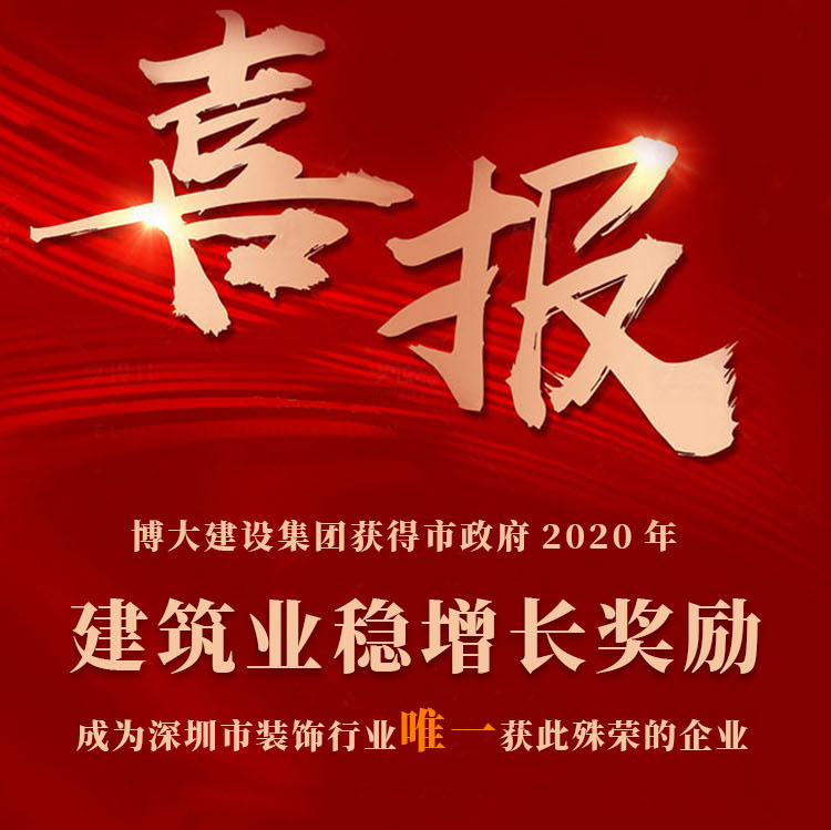 博大建設(shè)集團(tuán)榮獲深圳市政府2020年建筑業(yè)穩(wěn)增長(zhǎng)獎(jiǎng)勵(lì),博大是獲此殊榮的唯一一家裝飾企業(yè),當(dāng)之無愧成為深圳市的行業(yè)龍頭,為行業(yè)爭(zhēng)光。