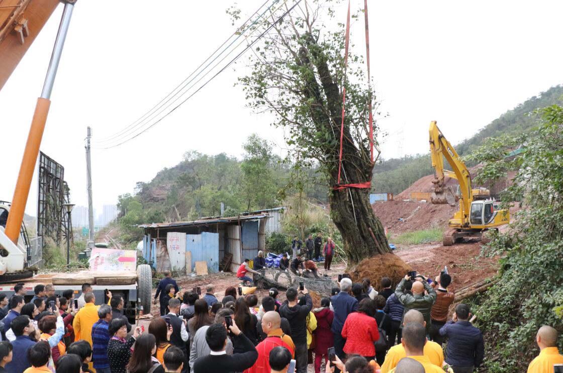寺門前,住持帶領僧眾接受捐贈,菩提古樹在重型吊機的牽引之下緩緩落座就位,佛家圣物回歸佛門,為寺添耀,為大眾積福報。