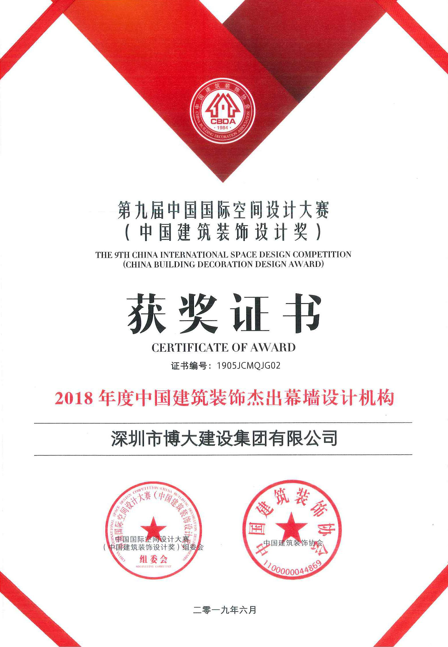 博大獲得2018年度中國建筑裝飾杰出幕墻設計機構,總裁李朕鴻榮獲商業方案類設計金獎,設計院院長方邵文榮獲娛樂空間方案類設計銀獎。