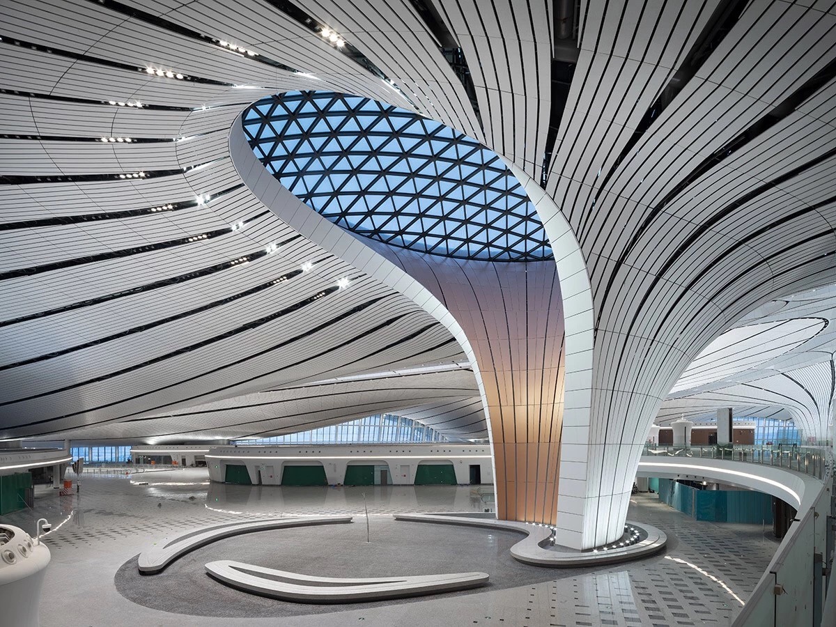 北京大興機場航站樓建設面積達140萬平方米,是世界上規模最大的單體航站樓。首次采用“放射”狀五指廊構型。中心點到最遠端是600米,走路最多8分鐘就能登機。