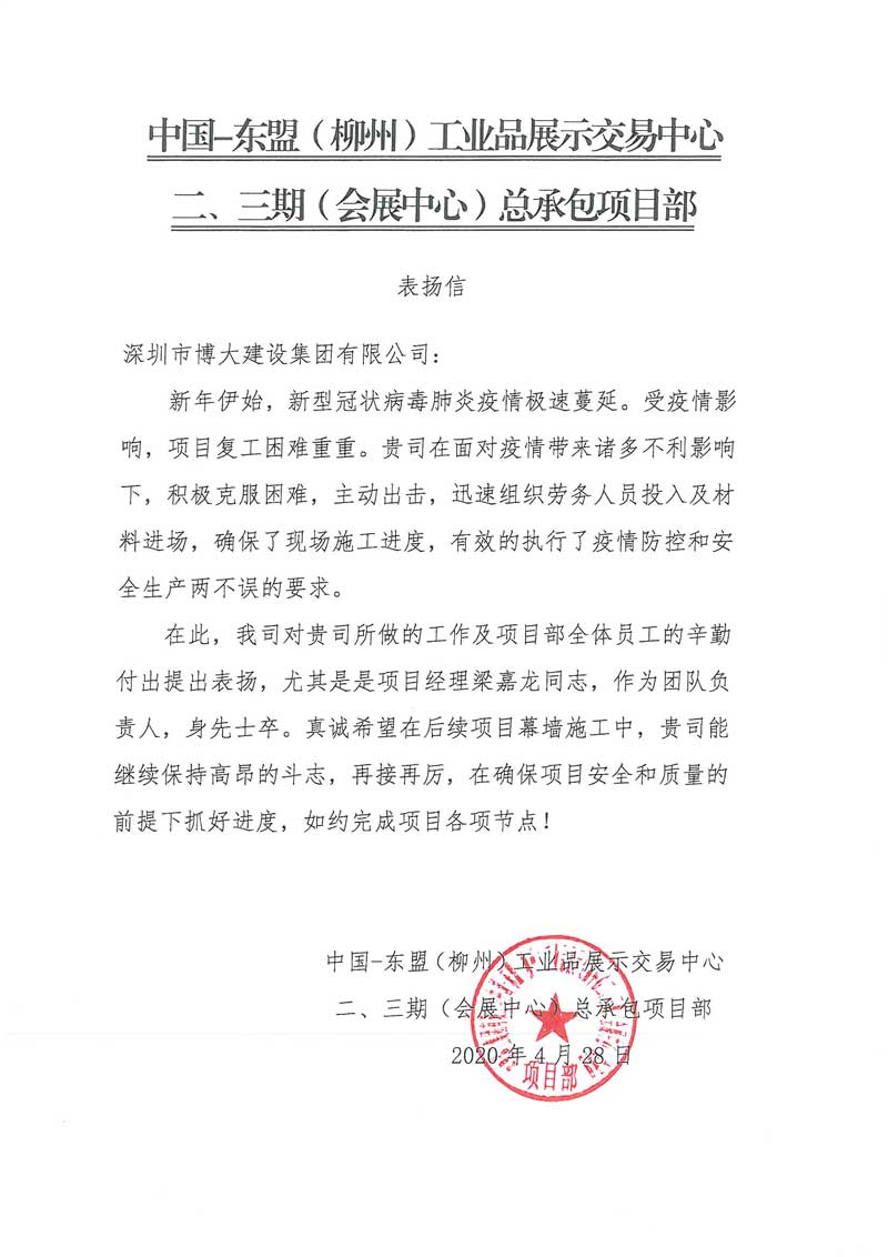 博大建設集團在中國-東盟(柳州)工業品展示交易中心二、三期(會展中心)項目中,積極克服疫情造成的困難,主動出擊,確保了現場施工進度,有效的執行了疫情防控和安全生產兩不誤的要求,獲得客戶表揚。