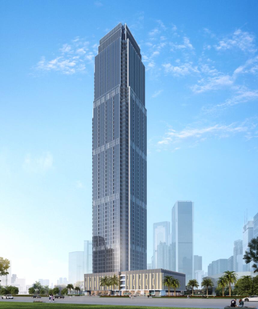項(xiàng)目位于防城港市江山大道與金花茶大道交匯處,是一棟大型商業(yè)、辦公、酒店綜合體,總建筑面積超過(guò)17萬(wàn)㎡,建筑高度達(dá)到271米,地上70層,是防城港市最高樓。