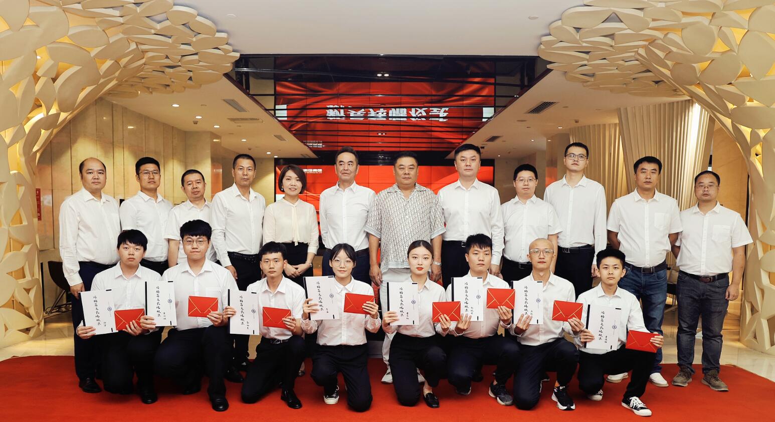 新兵代表與帶教師父,校董徐凱宏、洪宇,校長黃河,執(zhí)行校長劉子蓮合影