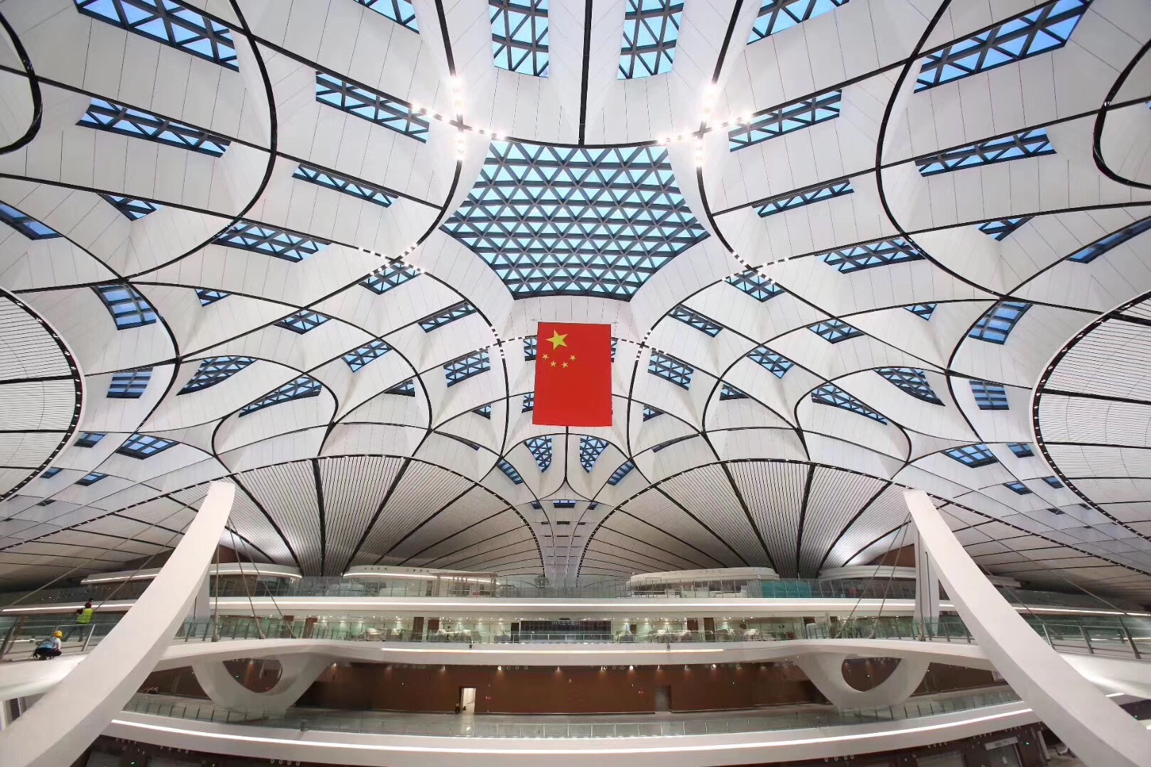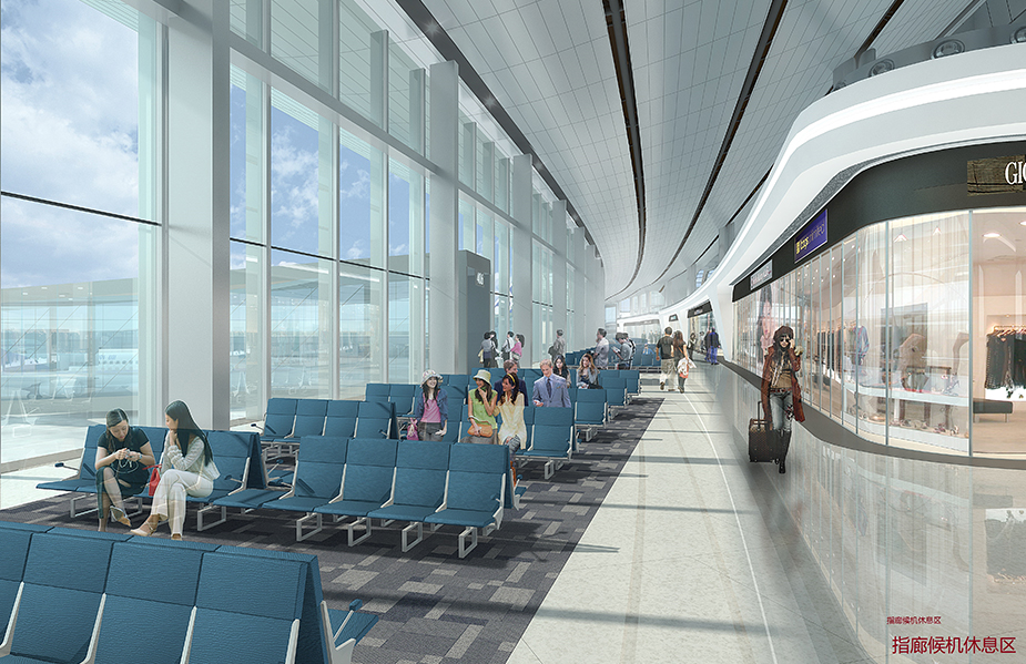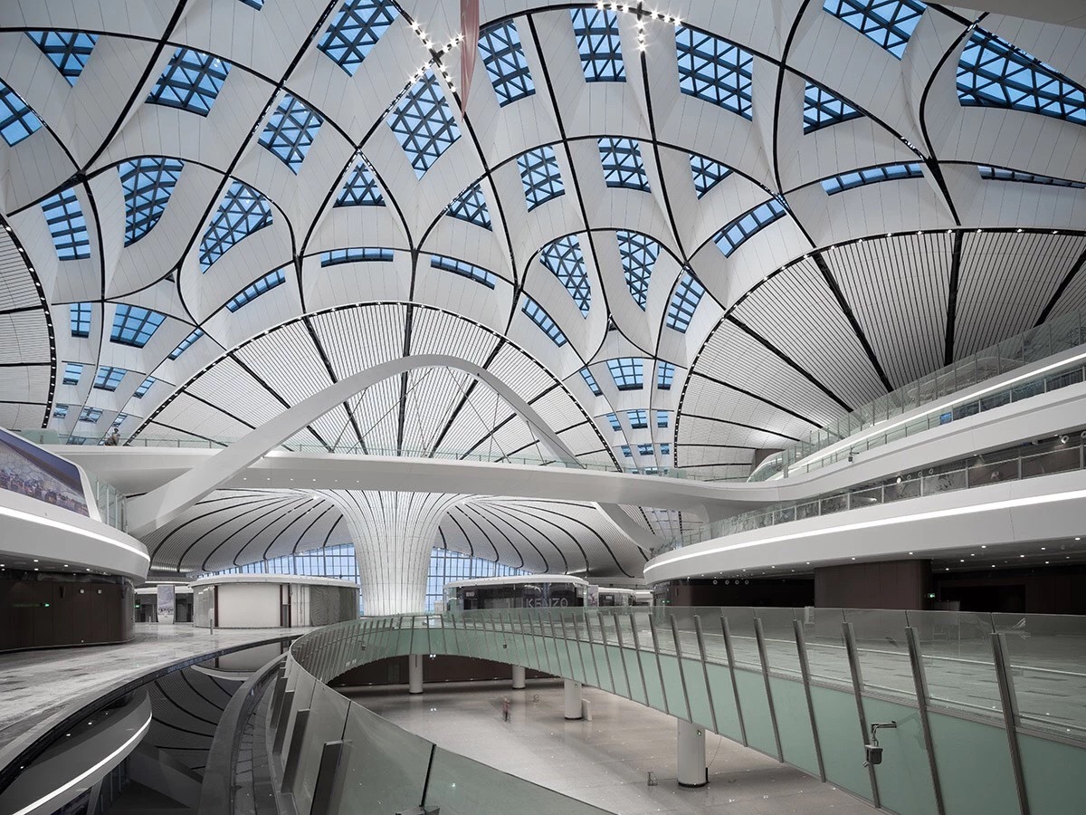 北京大興國(guó)際機(jī)場(chǎng)航站樓形如展翅的鳳凰,五指廊的造型完全以旅客為中心。整個(gè)航站樓有82個(gè)登機(jī)口,但是旅客從航站樓中心步行到達(dá)任何一個(gè)登機(jī)口,所需的時(shí)間不超過(guò)8分鐘。博大建設(shè)集團(tuán)承建了中南指廊國(guó)際出發(fā)到達(dá)區(qū)域室內(nèi)裝飾工程。